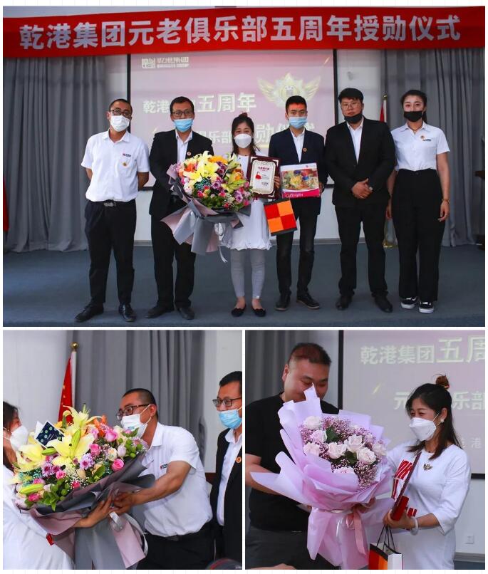 2020年5月28日,乾港集團(tuán)元老俱樂部五周年授勛儀式隆重召開,乾港集團(tuán)對(duì)3位工齡超過5年以上的老員工授予榮譽(yù)勛章,感謝元老們?cè)谇奂瘓F(tuán)發(fā)展中做出的貢獻(xiàn)。